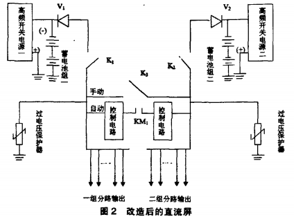 改進后的直流屏增加刀閘K1、K2、K3,兩個隔離二極管V1、V2,直流接觸器KM,及控制回路。這樣能更好地控制電源的輸人切換,便于維護。