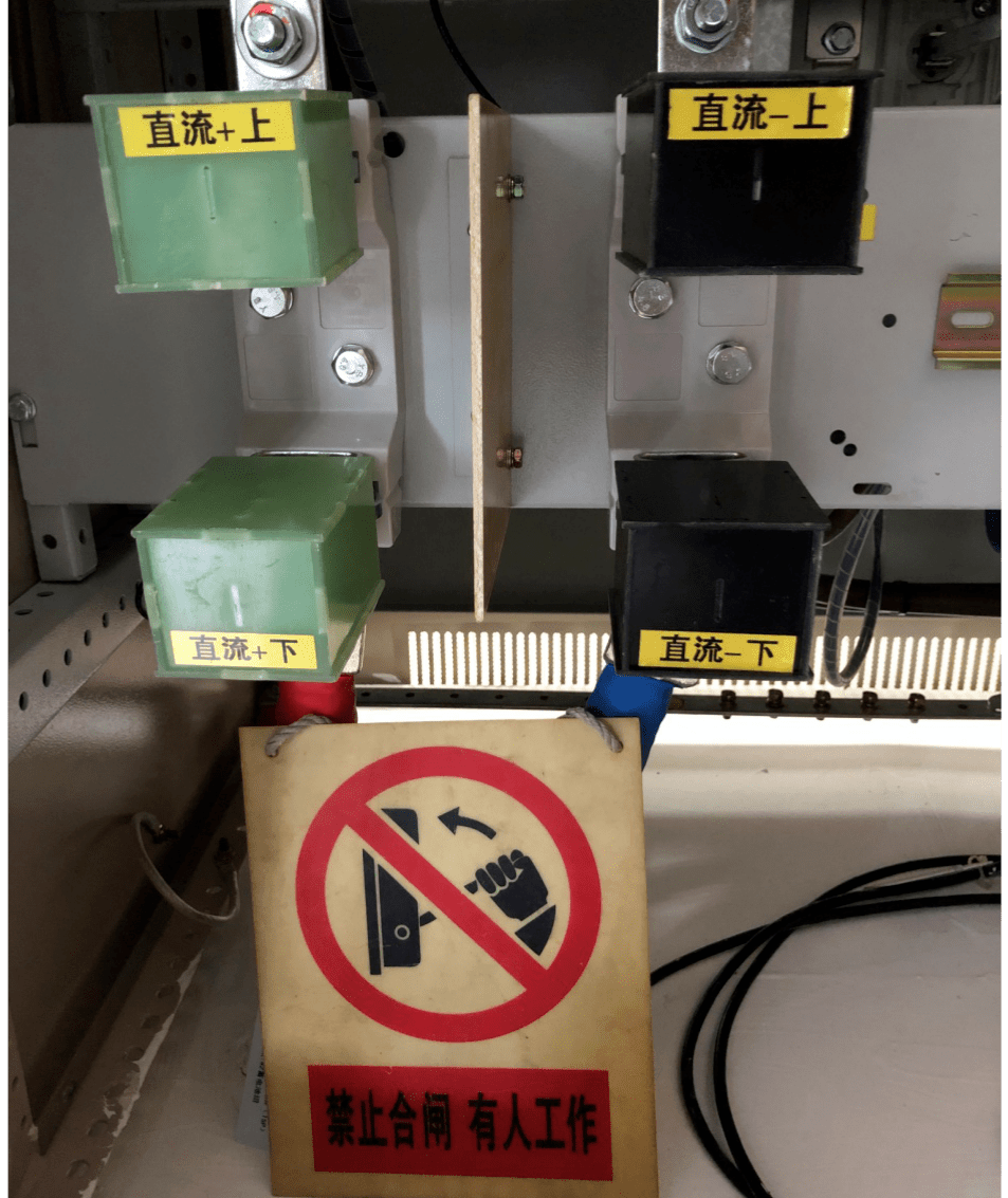 3. 取下蓄電池組保險后,在蓄電池保險的底座正極上下兩端、負極上下兩端分別套上大小合適的絕緣盒,并在絕緣盒上分別掛“禁止合閘,有人工作!”標示牌。