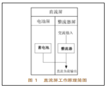 2直流屏作業(yè)原理圖1為直流屏作業(yè)原理簡圖。在圖1中,蓄電池和整流器組成了變電站的直流屏,當(dāng)有溝通輸入電源時(shí),整流器作業(yè),把溝通電整流成直流電,與蓄電池一同協(xié)作,供給直流負(fù)荷安穩(wěn)的直流電源。