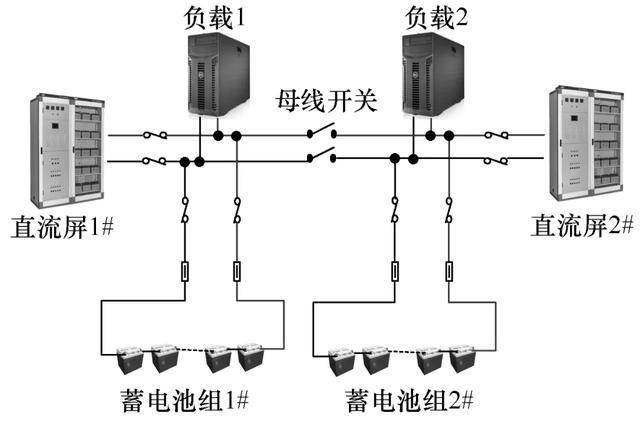 以220kV變電站直流屏體系為例,傳統(tǒng)的裝備為直流屏1#接蓄電池組1#,直流屏2#接蓄電池組2#,直流母線之間由開關(guān)操控,在呈現(xiàn)異?;虮Wo(hù)進(jìn)程中互為后備電源,其裝備如圖1所示。