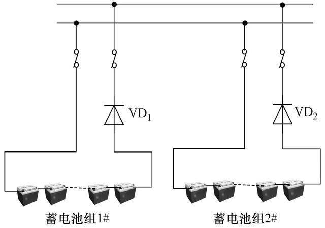 在外部交流供電異常時,蓄電池組由連接在直流屏正極與蓄電池組正極之間的大功率二極管VD1/VD2無縫對負載進行供電。放電通道并聯(lián)等效電路如圖4所示。在電池組并聯(lián)時,即便兩組電池存在電壓差,高電壓蓄電池組與低電壓蓄電池組之間也不導(dǎo)通,不存在充電回路,故避免了環(huán)流現(xiàn)象的產(chǎn)生。