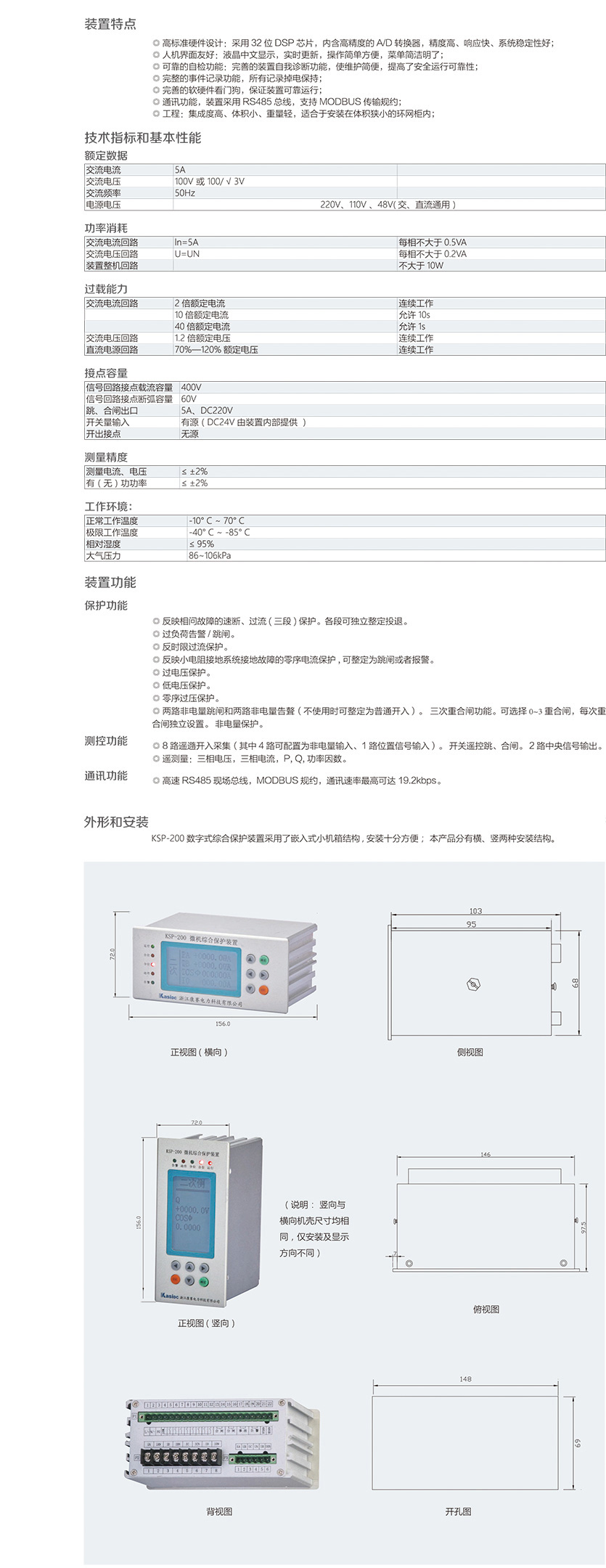 KSP-200 數(shù)字式綜合保護裝置是我公司為適應(yīng)我國電氣成套事業(yè)發(fā) 展的需要,積累多年電力自動化產(chǎn)品開發(fā)經(jīng)驗,運用新技術(shù)、新工 藝而推出的一款經(jīng)濟性綜合保護裝置。裝置結(jié)構(gòu)設(shè)計緊湊、體積小巧, 交直流電源通用,可滿足 10KV 及以下電壓等級進出線、廠用變等保 護測控功能。裝置適宜于安裝在體積狹小的環(huán)網(wǎng)柜內(nèi),構(gòu)成智能化 環(huán)網(wǎng)柜。